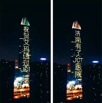 12月12日晚,濟南地标燈光秀綠地中心戶外LED廣告屏,突然高清版資源被(bèi)巨大的金色漢字所占據,大字緩緩呈現于樓身外牆:祝賀艾瑪通中文版丁香花過(guò)JCI,濟南有了JCI醫院。300米的濟南第一高度,四面(miàn)樓身均搭載巨國語美麗大的屏幕,在濟南夜空中特别醒目,數公裡(lǐ)之外仍清晰可見。